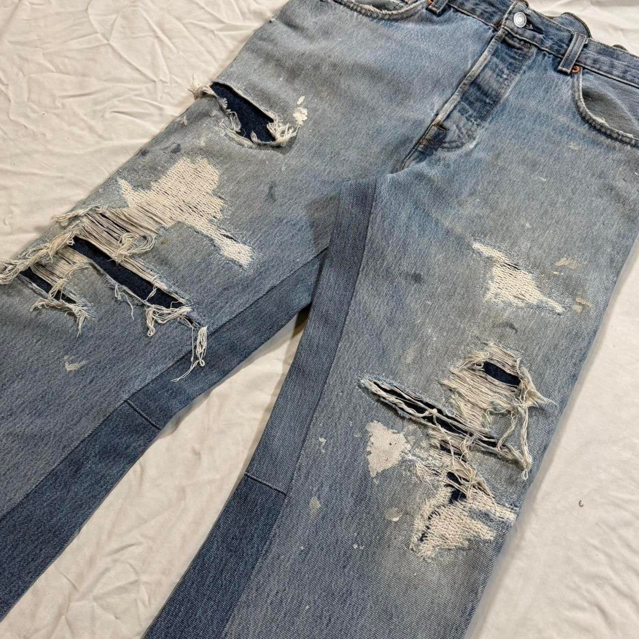 Flared Distressed/Repaired vintage washed blue Levi’s 501 denim